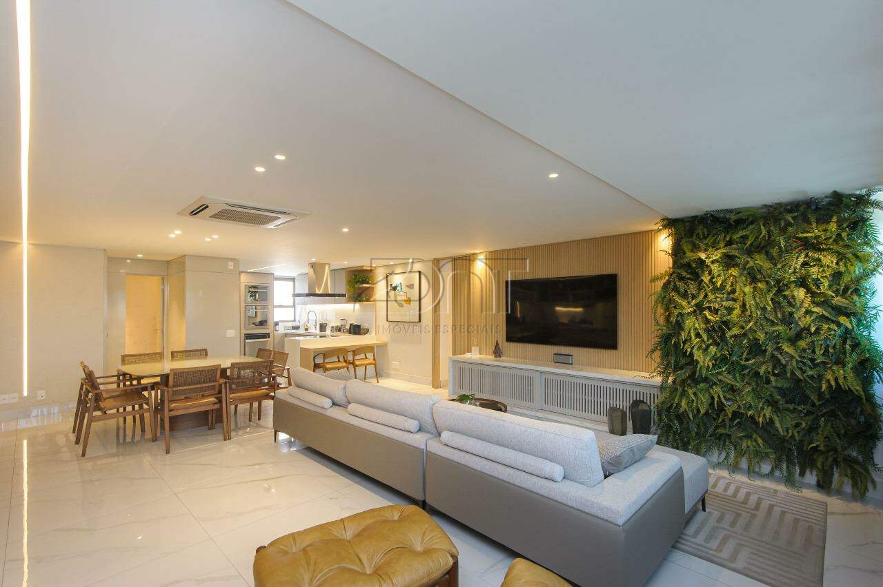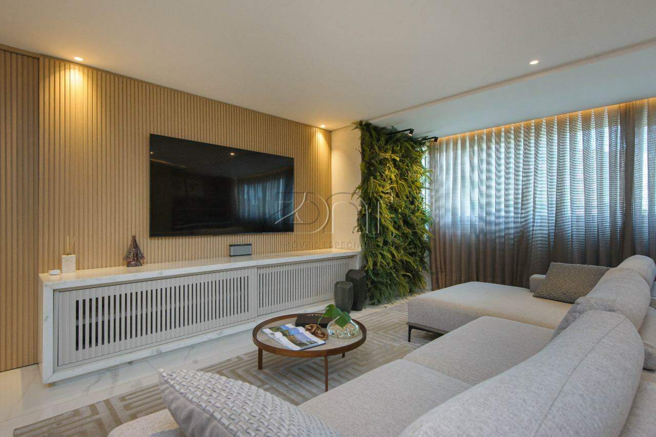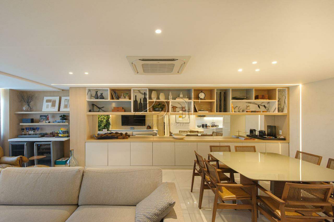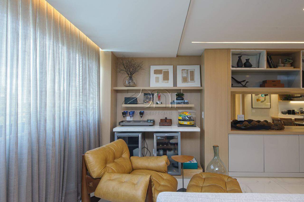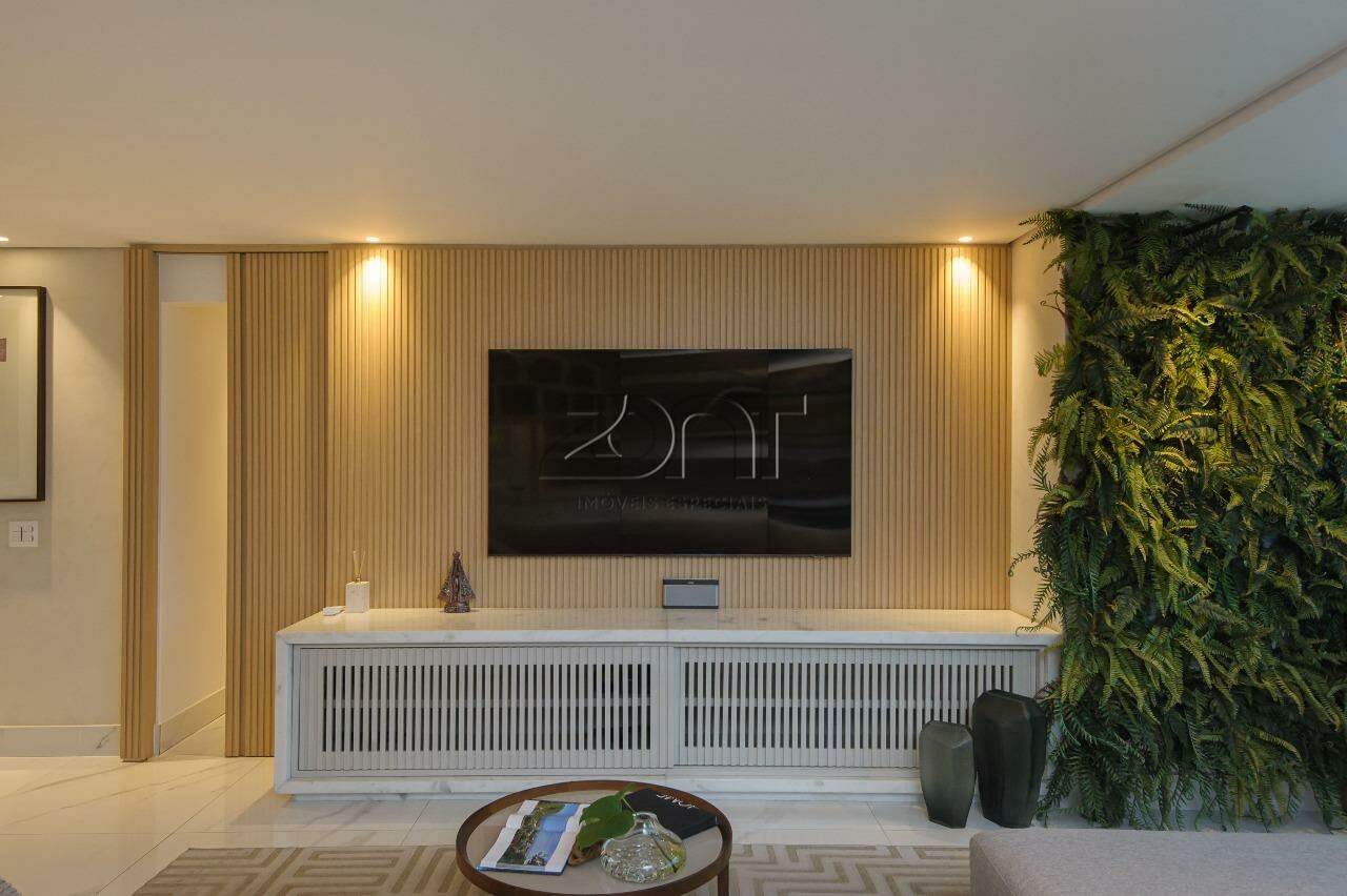 Desenvolvido em espaço interno de 144,00 m², este admirável projeto enche os olhos em cada detalhe executado. A sala, disposta em 3 ambientes distintos já ressalta o aconchego e afetividade propostos no projeto: O piso em porcelanato importado, a marcenaria e painéis em laca, o projeto de iluminação, a parede da sala revestida com lindo jardim vertical... cada minuciosidade reforça ainda mais a empatia do apartamento. A aprazível vista das janelas onde originalmente se dispunha a varanda é perfeita para desligar mente e corpo ao fim de um longo dia de trabalho. A cozinha... ahhh, a cozinha é uma obra de arte: bancadas em Silestone, marcenaria com alinhamentos perfeitos, cooktop por indução em vidro cerâmico, e diversos outros equipamentos completam este que certamente será o ambiente final de todas as confraternizações! Anexo à cozinha tem-se a funcional área de serviço e os indispensáveis quarto e banho para funcionários.