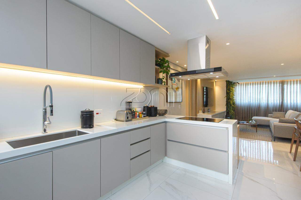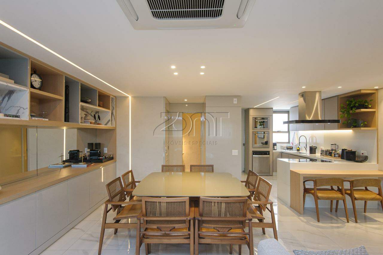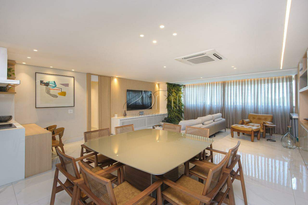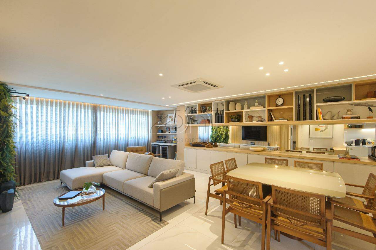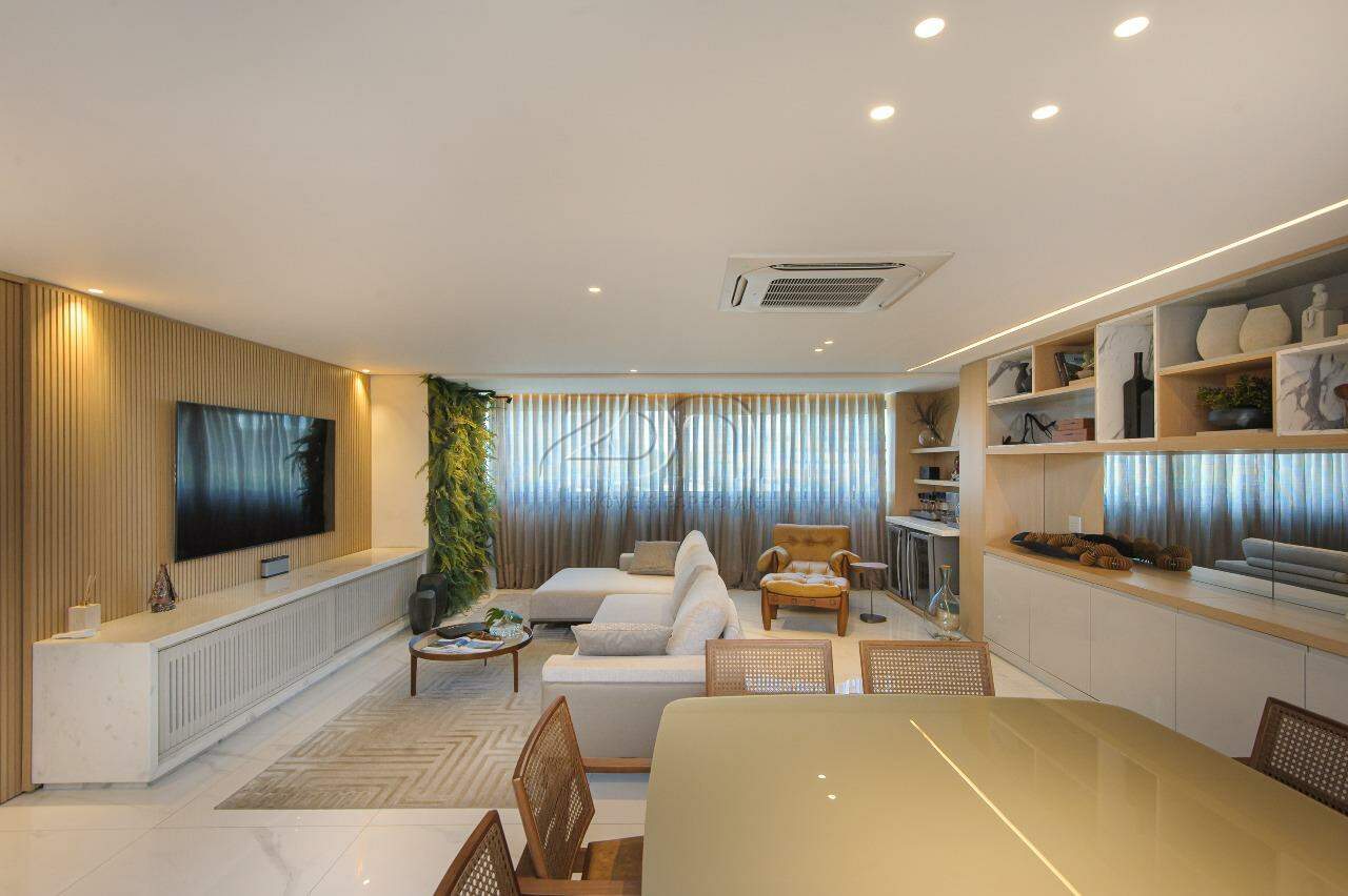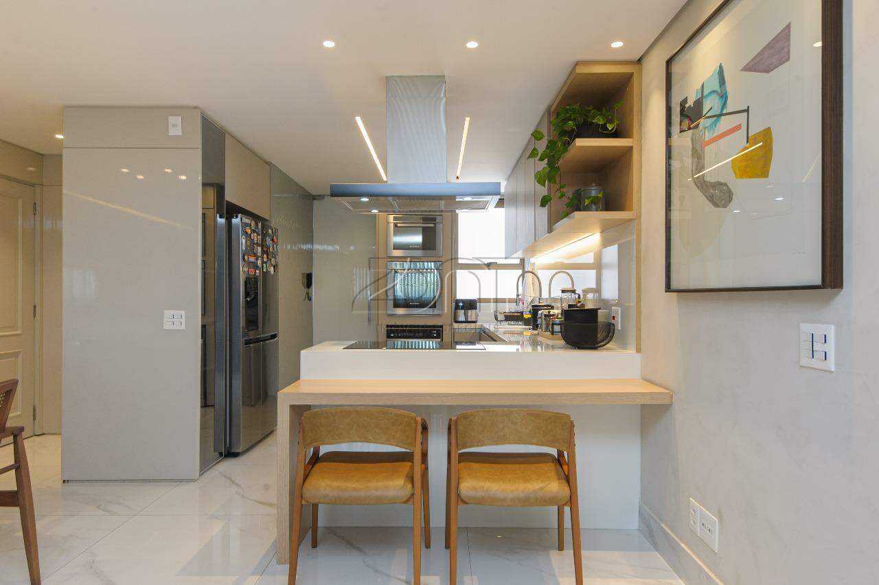 Desenvolvido em espaço interno de 144,00 m², este admirável projeto enche os olhos em cada detalhe executado. A sala, disposta em 3 ambientes distintos já ressalta o aconchego e afetividade propostos no projeto: O piso em porcelanato importado, a marcenaria e painéis em laca, o projeto de iluminação, a parede da sala revestida com lindo jardim vertical... cada minuciosidade reforça ainda mais a empatia do apartamento. A aprazível vista das janelas onde originalmente se dispunha a varanda é perfeita para desligar mente e corpo ao fim de um longo dia de trabalho. A cozinha... ahhh, a cozinha é uma obra de arte: bancadas em Silestone, marcenaria com alinhamentos perfeitos, cooktop por indução em vidro cerâmico, e diversos outros equipamentos completam este que certamente será o ambiente final de todas as confraternizações! Anexo à cozinha tem-se a funcional área de serviço e os indispensáveis quarto e banho para funcionários.