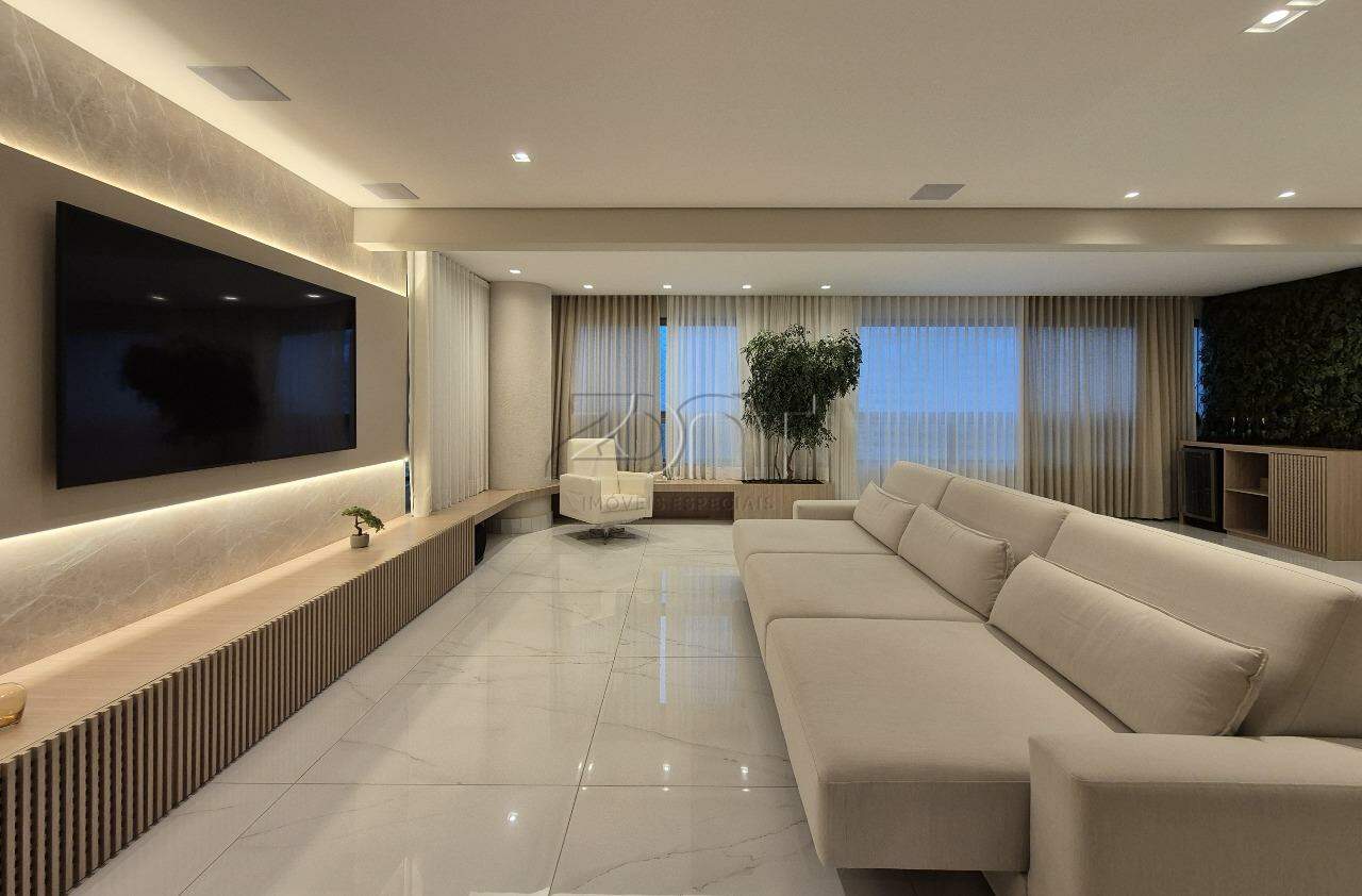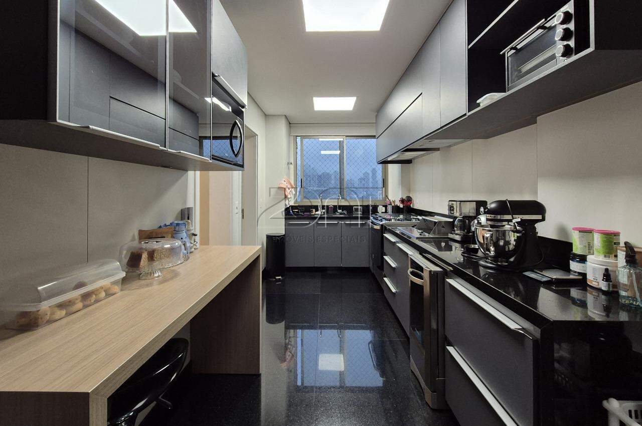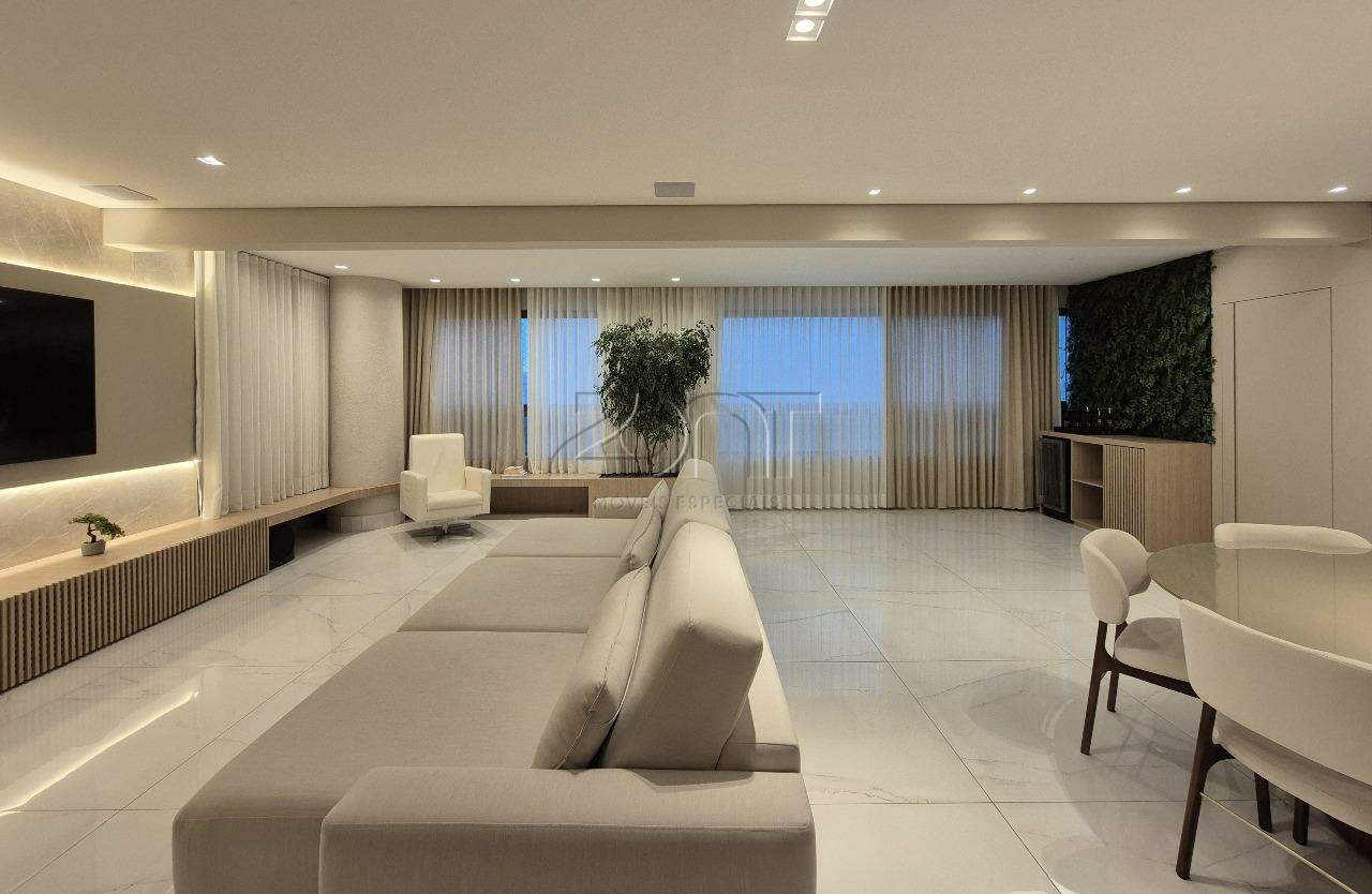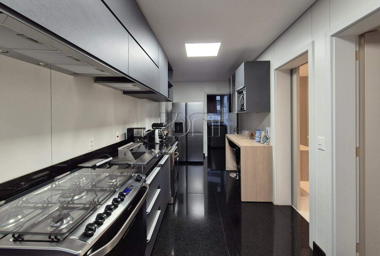 Morar em um apartamento com um projeto assinado faz toda a diferença, principalmente quando a proposta visa o conforto visual, térmico e lúmico. Aqui, o projeto de iluminação evidencia cada detalhe, elementos e cores utilizadas. Cada material escolhido - piso, painéis e marcenaria sob medida - se harmoniza em total equilíbrio e leva aos moradores um sentimento ainda maior de aconchego. Nos dias de sol, as amplas janelas se estendem por todo o comprimento da sala que recebe luz natural abundante e evidencia a natureza em seu horizonte. A convidativa cozinha dispõe de lindos e volumosos armários sob e sobre bancadas, espaço dedicado aos desjejuns, além de churrasqueira importada e perfeita para o preparo dos melhores cortes sem o odor espalhado pelo apartamento. A área de serviço não poderia de oferecer dimensão generosa, assim como a despensa e o quarto e banho para os funcionários.